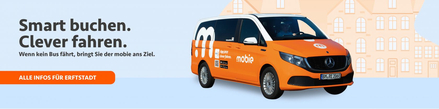 Laden Sie die mobie-App herunter und registrieren Sie sich einmalig, um anschließend schnell und einfach den mobie zu buchen. Geben Sie dazu Ihren Start- und Zielort und die Anzahl der mitfahrenden Personen ein. Bestätigen Sie im letzten Schritt den Fahrpreis und Ihr mobie ist gebucht.