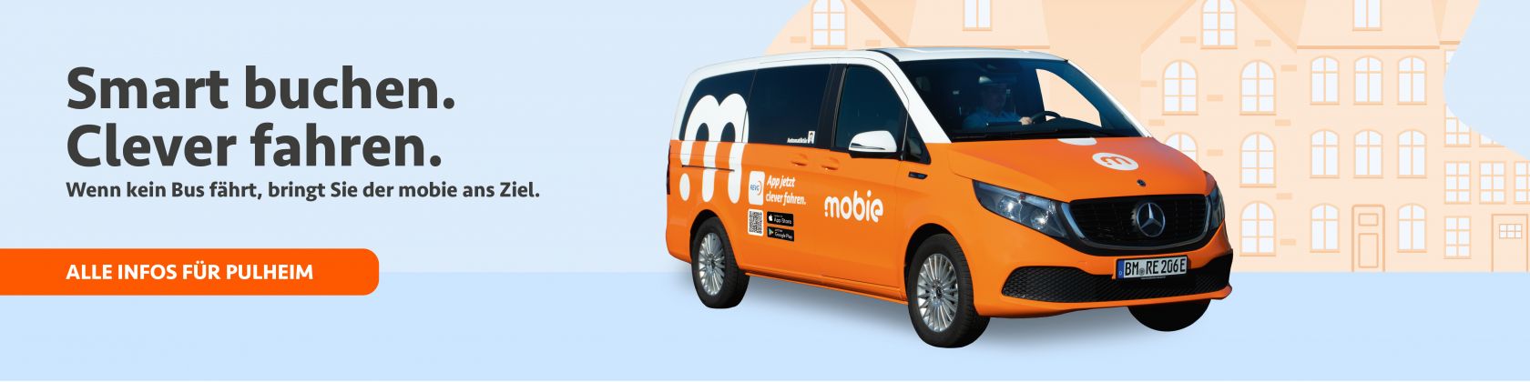 Laden Sie die mobie-App herunter und registrieren Sie sich einmalig, um anschließend schnell und einfach den mobie zu buchen. Geben Sie dazu Ihren Start- und Zielort und die Anzahl der mitfahrenden Personen ein. Bestätigen Sie im letzten Schritt den Fahrpreis und Ihr mobie ist gebucht.